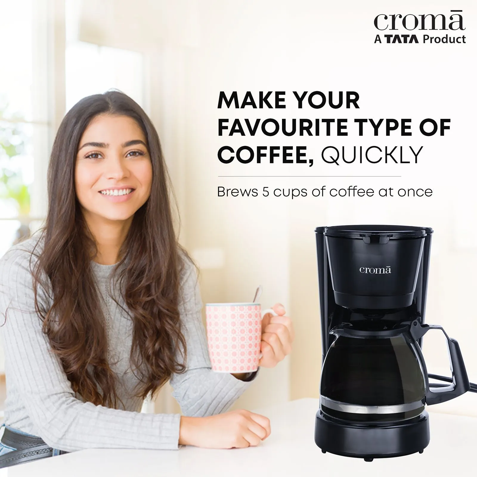Enjoy the ease of serving up to five cups of coffee at a time, thanks to the large 0.6L carafe of this Croma Coffee Maker. Whether you are brewing for your family or colleagues, this coffee maker has your back.