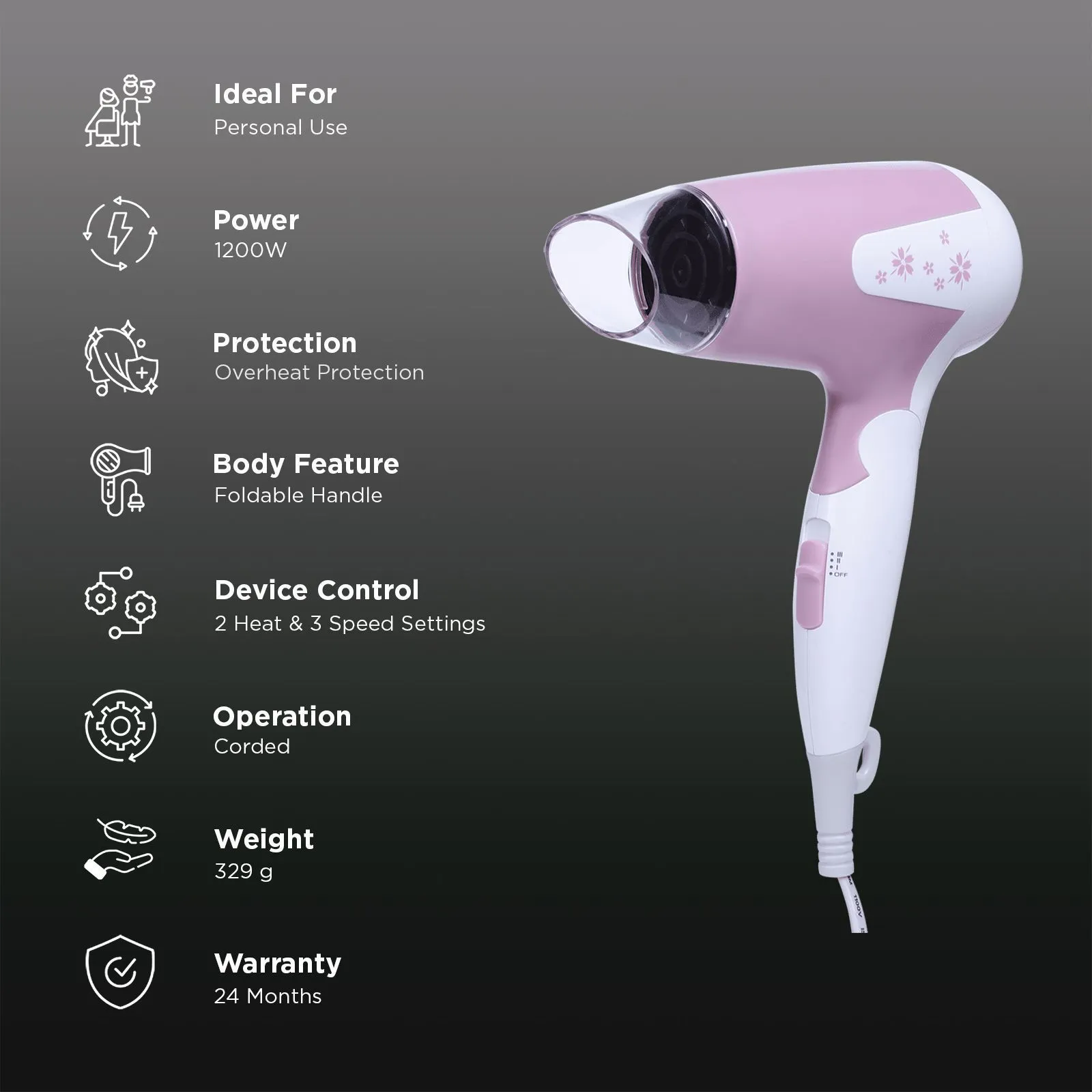 The heart of this hair dryer is its powerful 1200 W motor, which provides ample drying power without consuming excessive energy. It ensures your hair dries quickly while maintaining the smoothness and shine of your strands. The high-performance motor is ideal for both fine and thick hair types, offering reliable performance day after day.