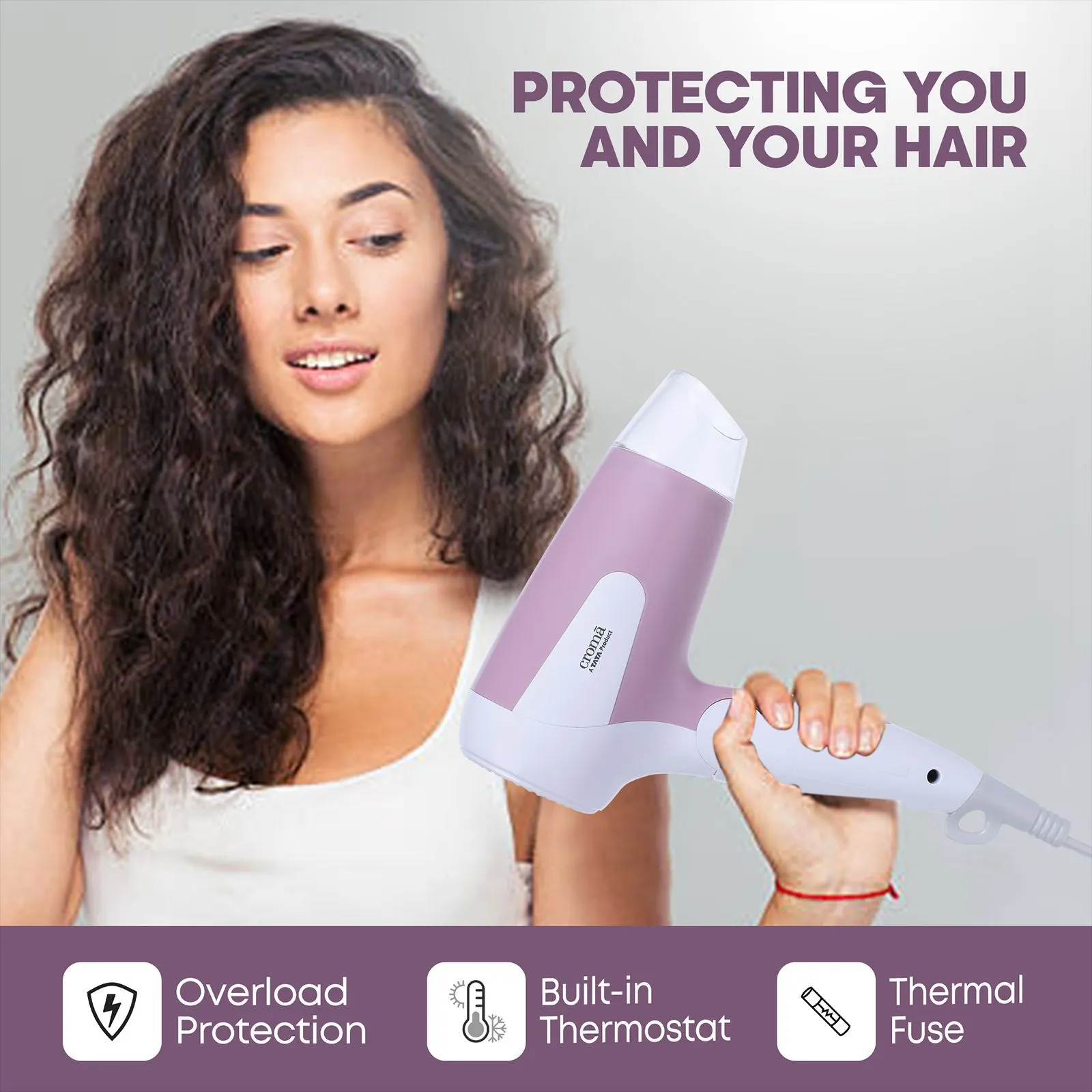 Safety is a key feature of the Croma Hair Dryer. It is equipped with overload protection, ensuring that the device automatically shuts off if it detects overheating. This prevents potential hazards and ensures the longevity of the appliance, giving you peace of mind while using it daily.