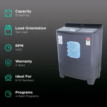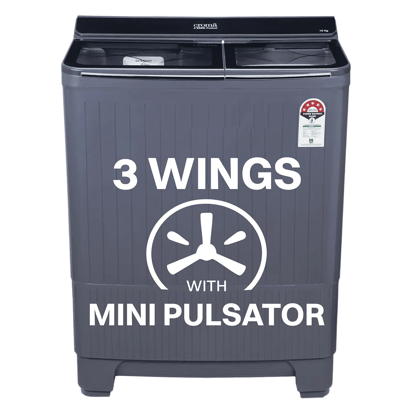 BuyΒ Croma 10 kg 5 Star Semi Automatic Washing Machine with Dual Waterfall MechanismΒ for efficient care and maintenance of your favorite clothes. This washing machine comes with a 10 kg wash tub and 6 kg spin tub capacity so that you can put in a larger load and wash all the clothes or fabrics with utmost ease. It features 4 different fabric care wash programs: Delicate, Normal, Gentle, and Strong to not only offer an effective washing capacity but also to protect the clothes from getting damaged. Its 3 wings with mini pulsator generate turbulent currents by rotating efficiently during the wash cycle by spinning the clothes back and forth which ensures a thorough wash, every single time. With its built-in soak function give your clothes that extra dose of cleaning with the active soak function. During the soak period, the motor periodically rotates the clothes for a minute, which ensures that the loosened dirt does not accumulate in one place. The memory backup function features automatic resumes of the wash cycle where it was interrupted. This feature sports a very useful advantage where there is an abrupt electricity supply.