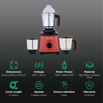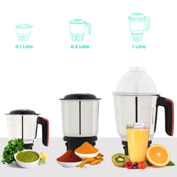 Equipped with three jars of different capacities, including a 1000ml liquid jar, 500ml dry jar, and 100ml chutney jar, this 750W mixer grinder caters to a wide range of culinary needs. From large batches of purees to small quantities of spices, you can achieve optimal results for every recipe.
