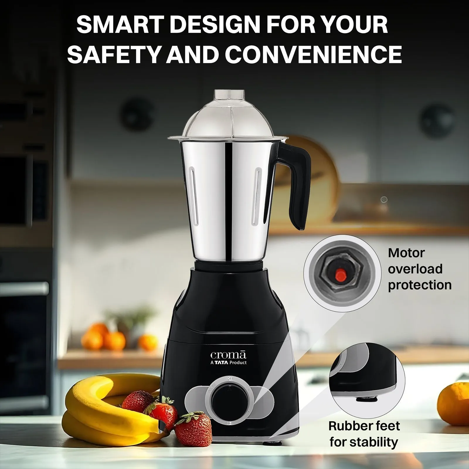 At the core of the E-Croma Mixer is its powerful 750-watt motor, which delivers outstanding performance even with tough ingredients. This robust motor ensures that the mixer operates efficiently, grinding and blending ingredients to the desired consistency quickly and effectively. From tough nuts and spices to fruits and vegetables, the 750W motor is strong enough to handle it all, making your kitchen prep faster and easier.